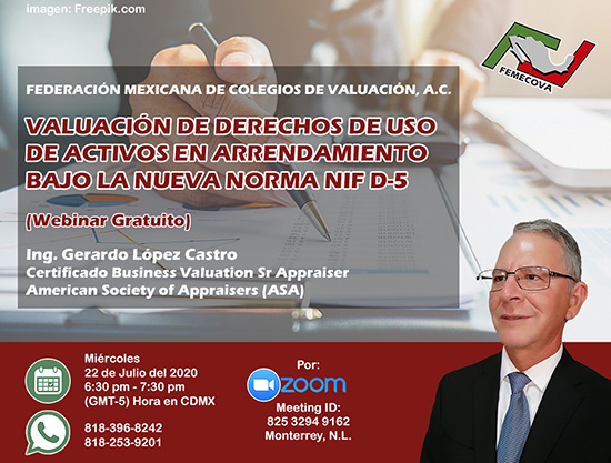 El presente 22 de Julio del 2020 se realizó el Webinar: "Valuación de Derechos de Uso de Activos en Arrendamiento bajo la nueva Norma NIF D-5", por parte de la Federación Mexicana de Colegios de Valuación, A.C.