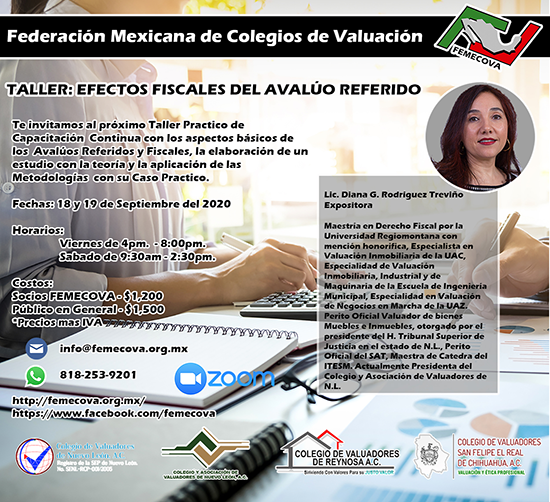Los días 18 Y 19 de Septiembre del 2020 se llevó acabo el Curso: "Efectos Fiscales Del Avalúo Referido", por parte de la Federación Mexicana de Colegios de Valuación A.C., vía ZOOM, con la Expositora: Lic. Diana G. Treviño. con 10 Horas de validez curricular.