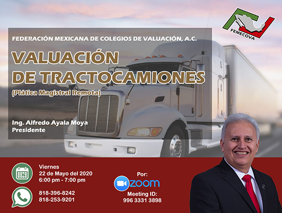 El presente 22 de Mayo del 2020 se realizó la primera ponencia de forma remota ó Webinar: "Valuación de Tractocamiones", por parte de la Federación Mexicana de Colegios de Valuación, A.C.